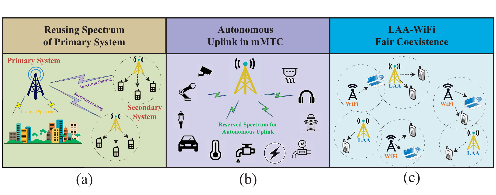 图1. 5G生态体系中涉及智能感知的几个典型应用场景,分别为(a)常规5G通信场景;(b)工业4.0及智能物联网场景;(c)异构网络混合共存场景