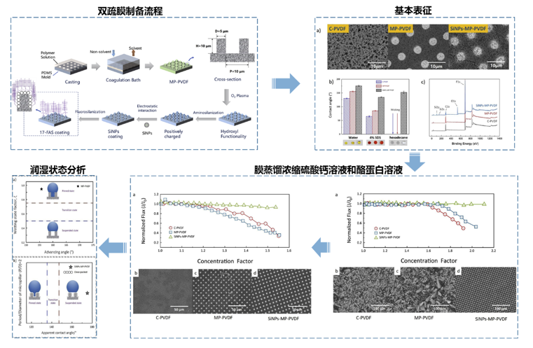 2.基于超疏水微米柱膜,对表面进行正电荷改性,顺利获得静电吸附作用负载二氧化硅纳米粒子,构建双疏膜SiNPs-MP-PVDF,对纯水(γ = 72.8 mN/m)的接触角高达175.6o,滚动角为3.5o,对低表面张力的十六烷(γ = 27.5 mN/m)接触角达到151o,在浓缩硫酸钙料液和酪蛋白溶液中表现出优异的性能。相关成果以“Unprecedented scaling/fouling resistance of omniphobic polyvinylidene fluoride membrane with silica nanoparticle coated micropillars in direct contact membrane distillation”为题发表在Journal of Membrane Science(图3).