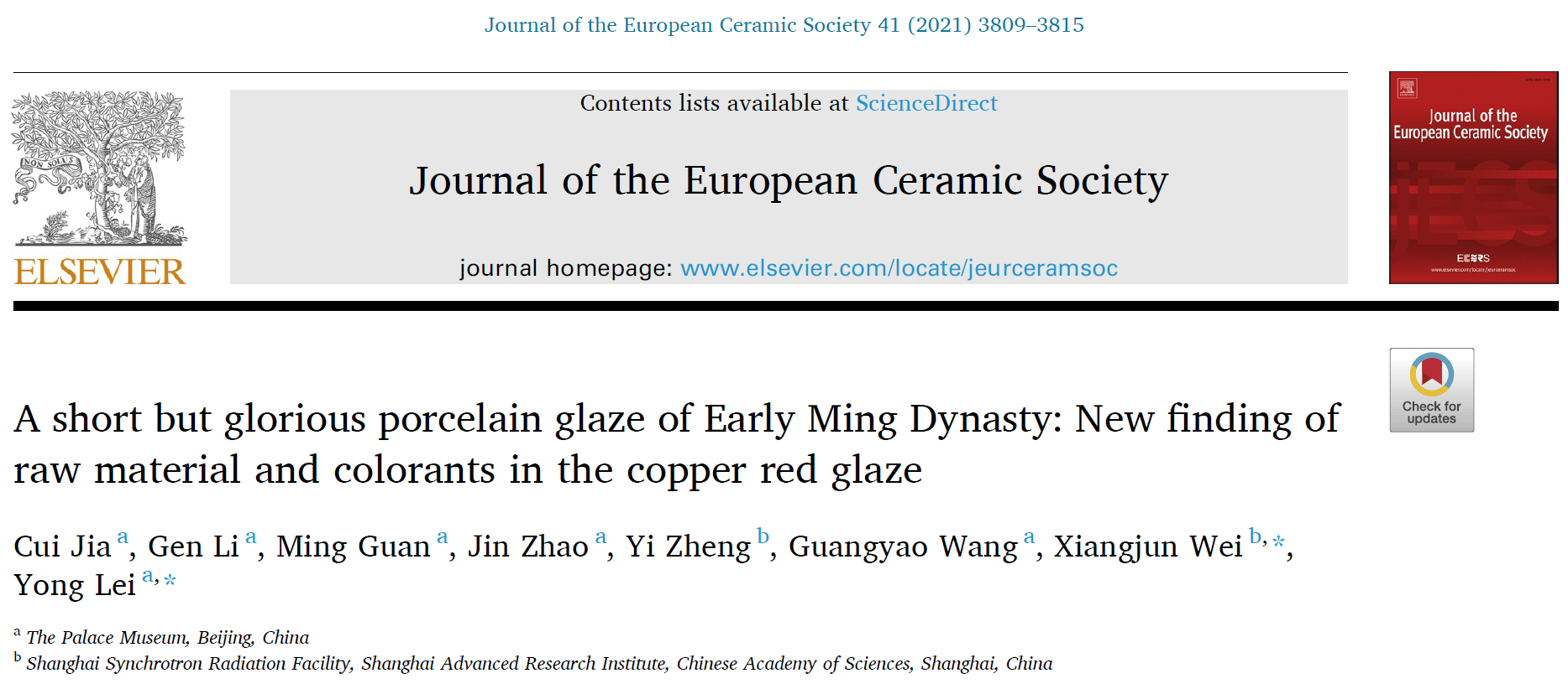 故宫博物院(文保科技部、考古研究所)与中科院上海高等研究院/上海光源针对故宫考古出土的明代洪武时期(14世纪后期)釉里红瓷片召开了合作研究,最新的研究成果(第一作者贾翠)发表于最近出版的《欧洲陶瓷协会会刊》
