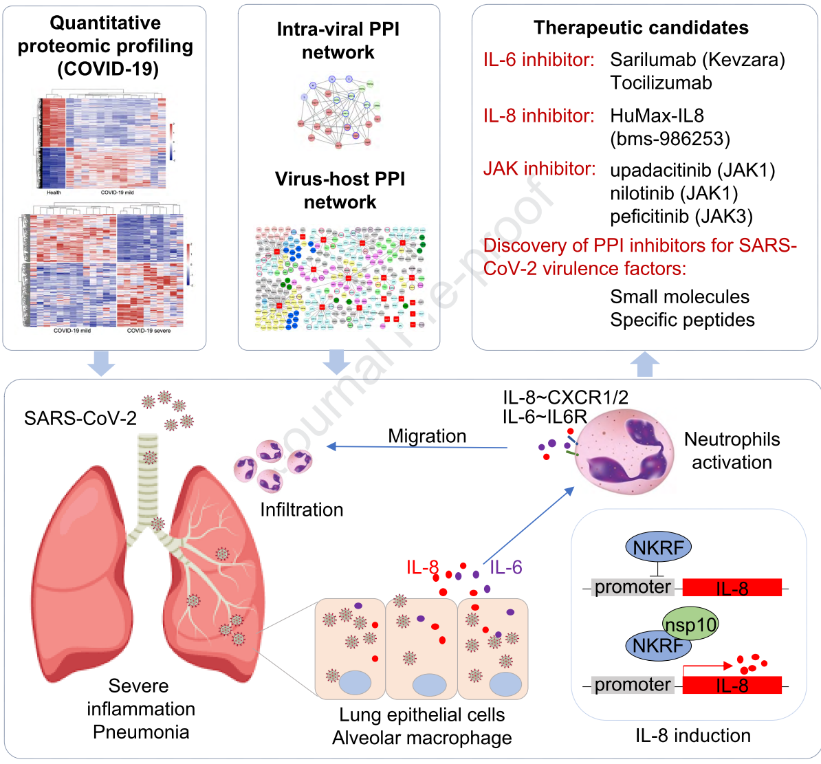 研究人员第一时间在HEK293细胞中表达了绝大部份SARS-CoV-2病毒蛋白,顺利获得AP-MS的方法鉴定到286个宿主蛋白与该病毒存在特异性相互作用,对它们进行通路分析揭示了病毒蛋白与细胞炎症和先天性免疫响应相关蛋白的特异性相互作用,关键的病毒-细胞蛋白网络影响了病毒蛋白nsp10与细胞蛋白NKRF的相互作用。为阐明SARS-CoV-2病毒侵染对人体造成的影响,研究人员对41例临床PBMCs样本(6个健康人、22个轻症患者、13个重症患者)进行了深度的定量蛋白质组学分析:共鉴定到6739个蛋白,4274个蛋白质能够在3类样本中被定量到。顺利获得对样本质谱定量数据的统计学分析与信号通路分析发现:与健康人相比,患者体内的T细胞激活、中性粒细胞介导的免疫反应等通路发生显著变化。其中,白介素-8等细胞趋化因子的表达在患者血液中发生了显著的上调;后期生化实验也验证了IL-8和IL-6在重症患者中显著升高,治愈后可恢复到初始水平。