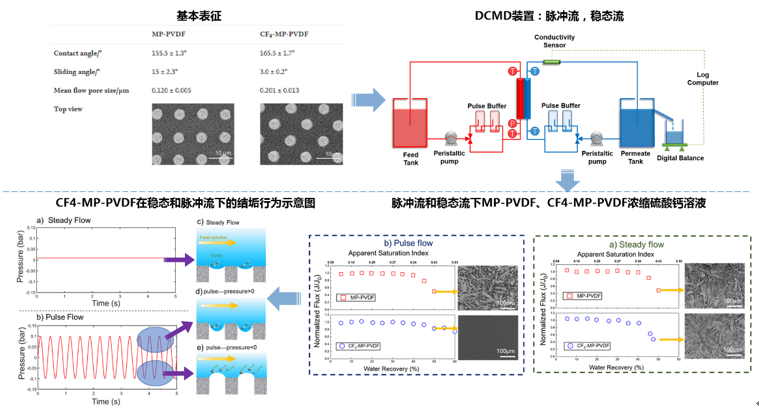 4.在前面的研究中,课题组顺利获得对疏水材料进行表面设计及改性,发现了气-液界面的存在对耐结垢性能的重要影响,以此为出发点,顺利获得操控实验的工艺条件,阐述了脉冲流与表面滑移之间的协同作用机理,相关成果以“Synergy of slippery surface and pulse flow: An anti-scaling solution for direct contact membrane distillation”为题发表在Journal of Membrane Science (图4).