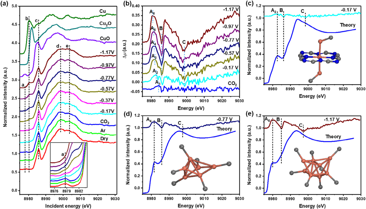 CO2电化学还原反应(CO2RR)为“碳达峰”、“碳中和”的目标给予了一条行之有效的路径。由于缺乏对活性位点结构演变的深入分析,阻碍了高效催化剂的进一步合理设计。因此,实时监测这些变化,识别中间体在活性位点上的吸附、解离等过程,对于建立活性位点的结构与性能相关性以及设计最佳催化剂和反应条件具有重要意义。然而,随着催化体系的复杂化,从原子、分子水平上定量理解电化学CO2还原反应过程中催化剂结构变化对反应性能的影响不断都具有挑战性,而传统的原位X射线谱学方法在追踪催化剂活性位点的动态结构变化方面发挥的作用有限。因此,亟需高能量分辨X射线谱学方法应用于原位观测催化剂活性中心的局域原子、电子结构变化。顺利获得高分辨谱学方法研究活性位点的构型和动态结构变化,为阐明复杂的催化机理给予了一种新颖而有力的方法,并有望为高效催化剂的合理设计给予参考。CuPc作为模型催化剂,具有经典的CuN4C8位点结构。将其应用于催化CO2RR,随着电压的施加,逐渐产生了C2H4等多碳产物。为了厘清反应过程中的活性位点的结构变化,研究人员顺利获得原位高分辨谱学方法进行了探究。