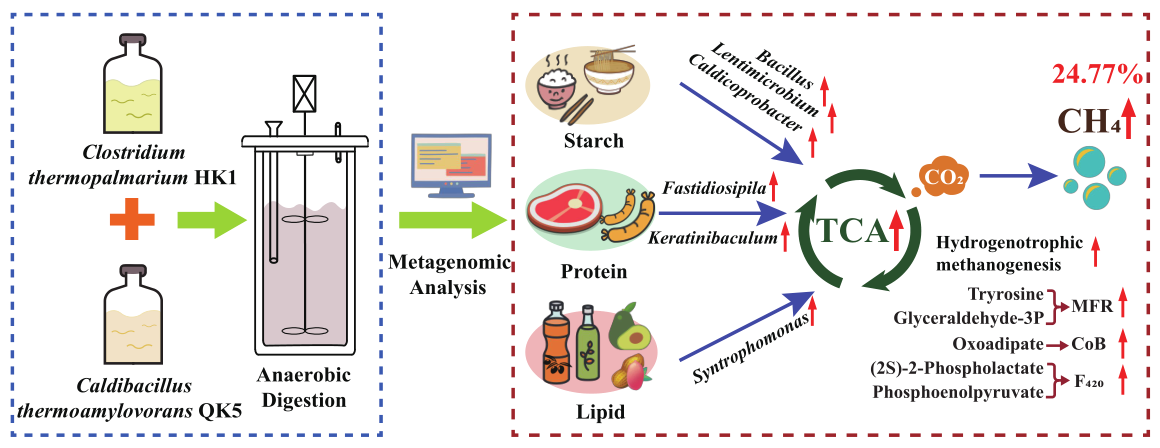 图1. 多菌株协同生物强化提高厌氧发酵产甲烷性能示意图